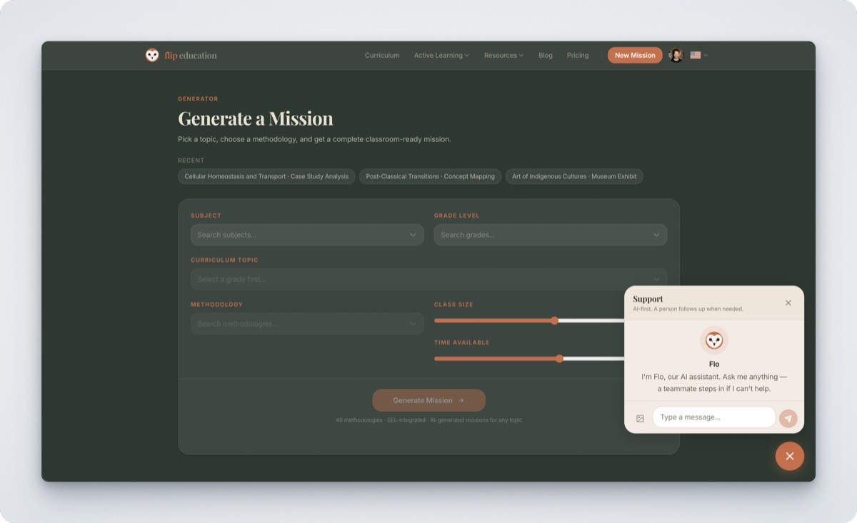Every page in Flip Education now has Flo, a new helper built on today's best AI models. Flo knows the app inside out: the methodologies, the curriculum, how to adapt a mission for your class.