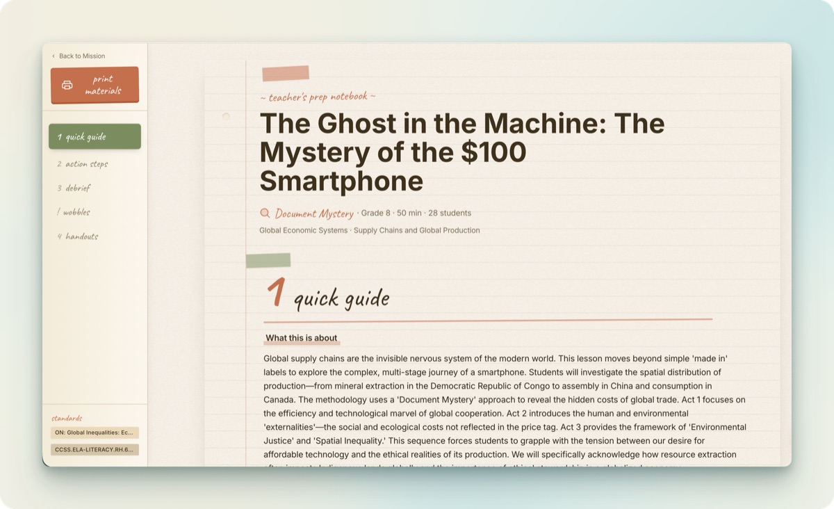 We redesigned the teacher view of every mission. It now reads the way you actually read a lesson plan: a clean section order, the exact prep checklist you need, and each handout on its own page (or grouped together when that makes more sense). Clean enough to hand to a substitute or share with a co-teacher.